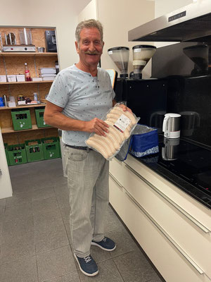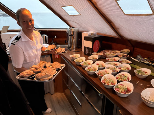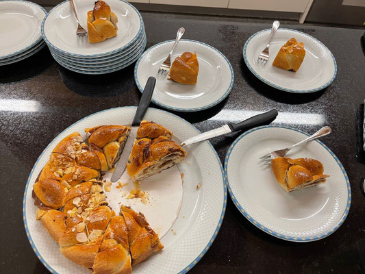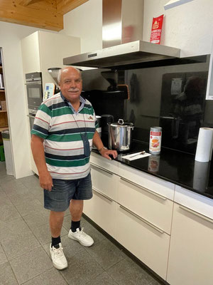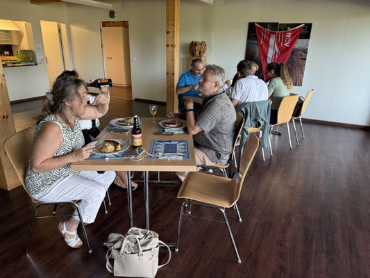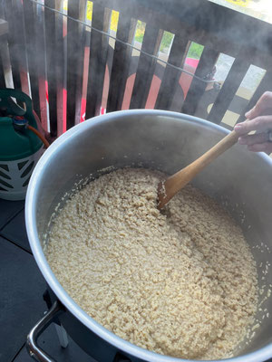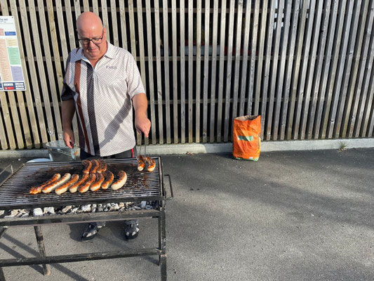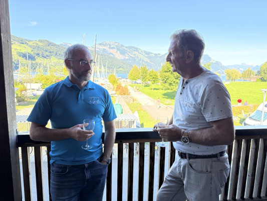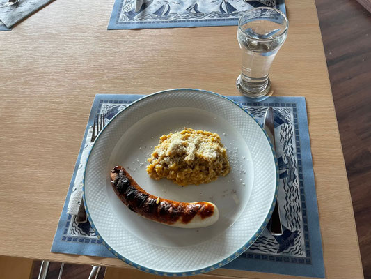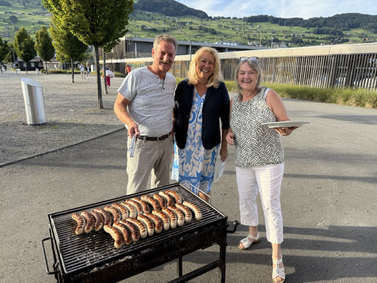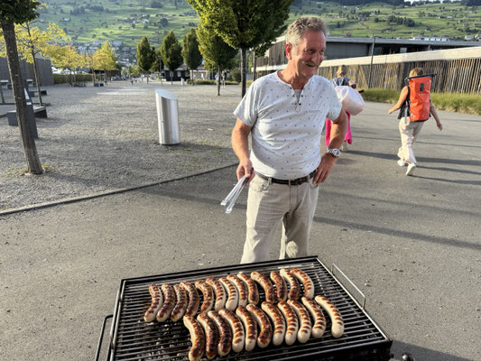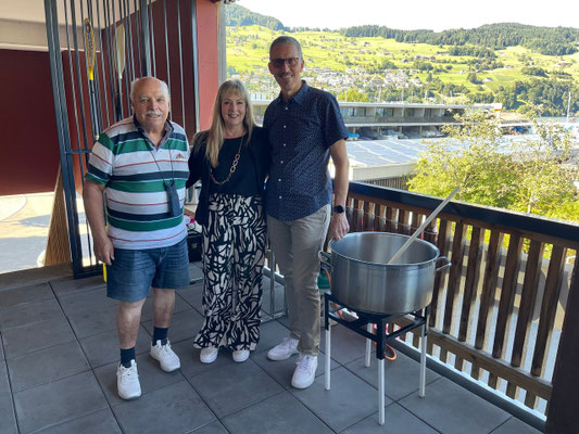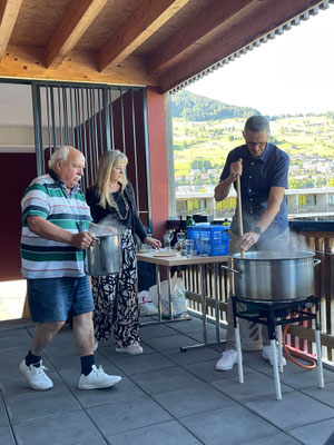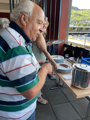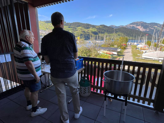 Heute verwöhnte uns Peter Beltramini und seine "Crew" mit leckerem Risotto im Wassersportzentrum Nidwalden. Das Wetter wieder traumhaft. Auf der Terrasse konnten sich unsere Gäste ausgiebig zu einem Glas Wein und Knabereien unterhalten, während die "Crew" sich so langsam ans Werk machte. Mit perfektem Timing wurde das Risotto und die Würste miteinander fertig. Es hiess: Essen fassen! Nach einem sehr feinen Steinpilz-Risotto mit Kalbsbratwurst, konnten wir das Ganze mit von Urs Beck mitgebrachten Hefenuss-Kränzen abrunden.