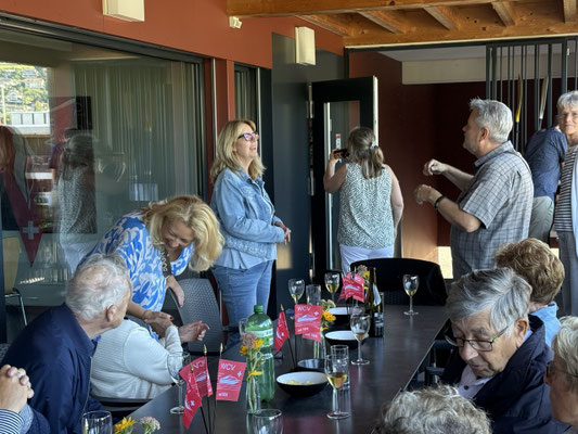 Bei herrlichem Wetter genossen 24 Teilnehmer den offerierten Apéro mit feinen Bruschetta auf der Seeterrasse im Hotel Winkelried, Stansstad. Da einige im Stau auf der A2 stecken blieben, dauerte der Apéro viel länger, was der guten Stimmung nichts schadete. Das anschliessende schmackhafte Mittagessen im Turmsaal mit Vorspeise, danach mit Fisch oder Fleisch genossen alle. Anschliessend forderten René und Joe alle mit einem Wettbewerb per sehr gut gelungener Powerpoint-Präsentation. Die 20 Fragen deckten ein breites Wissen im nautischen Bereich ab. Alle Teilnehmer durften sich dann entsprechend der Rangliste wunderbare und sehr wertvolle Preise aussuchen. Ganz herzlichen Dank allen Preisspendern. Danach genossen wir das sehr feine Schoggimousse-Dessert mit marinierten Zwetschgen. Langsam mussten sich dann einige auf den Heimweg machen. Über 10 Personen liessen jedoch den Abend in der Pizzeria mit einem köstlichen «Pizza» ausklingen. Wiederum durften wir einen sehr tollen und abwechslungsreichen Anlass erleben.